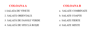 b) Realizați corespondența între coloana A și coloana B, astfel, indicați grupa alimentară specifică pentru fiecare salată.(5x2p=10p)