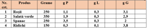 1. Calculați valoarea calorică a următoarelor legume, știind că la 100 grame produs avem: